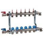 RVS verdeler met ronde buis. Aansluiting 1″ binnendraad met vlakke afdichting. Afsluitbareflowmeter met schaalverdeling van 0-4 l/min. Tussenafstand uitgangen: 50 mm. Iedere zone heeft3/4″ euroconus aansluitingen. Aanvoer bovenaan. Klaar voor montage op muurbeugel. Inclusiefeindset (voor spoelen, vullen en aftappen) en kogelkraanset met thermometers. Verkrijgbaar van 2tot 12 zones. Maximale werkdruk: 5 bar bij 80 °C. Maximale testdruk: 10 bar bij 20 °C.